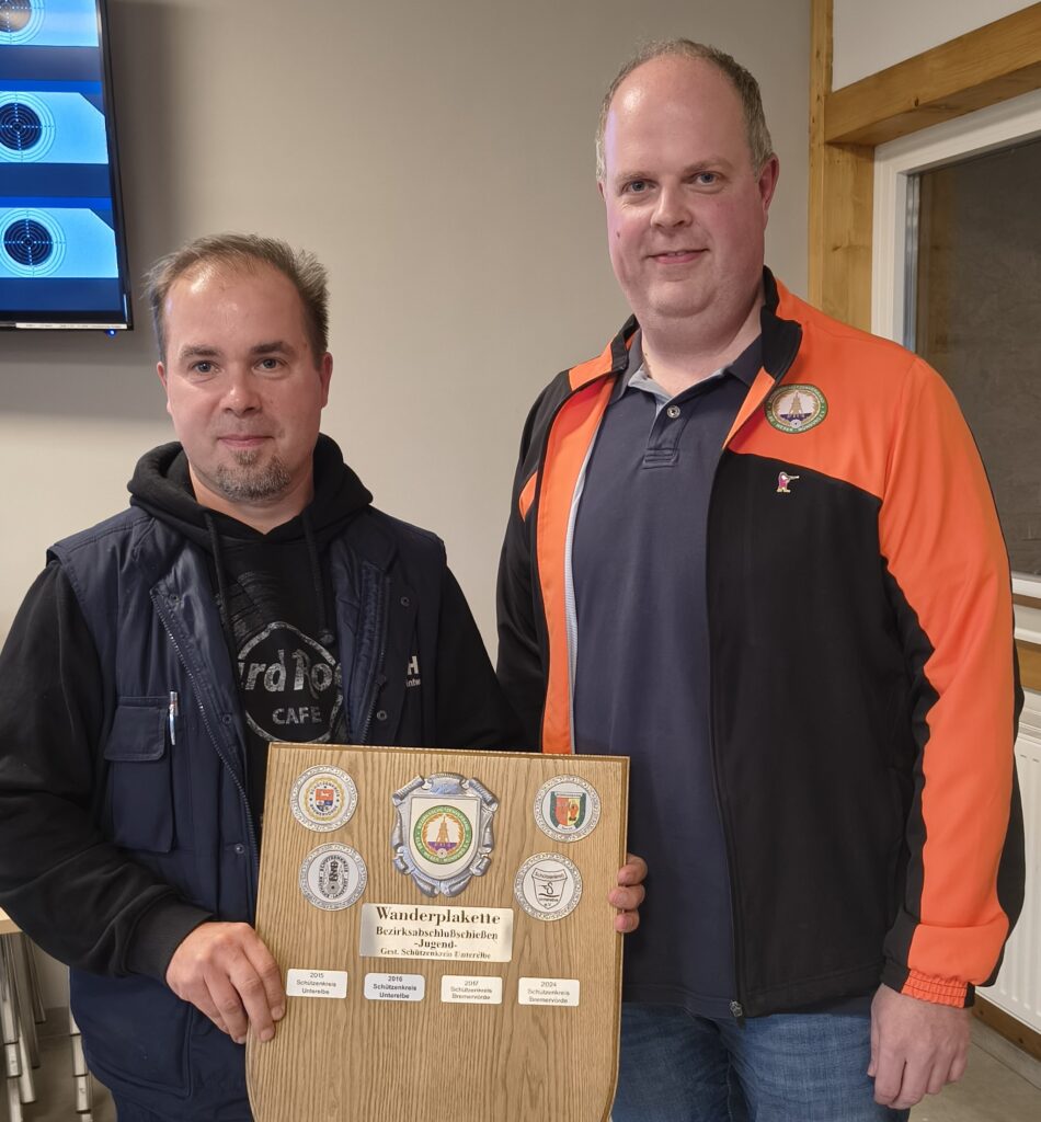 Bezirksjugendsportleiter Lars Busch (rechts) überreichte den Wanderpokal des Bezirksabschlussschießens dem Bremervörder Kreisjugendsportleiter Dennis Gerdel.
