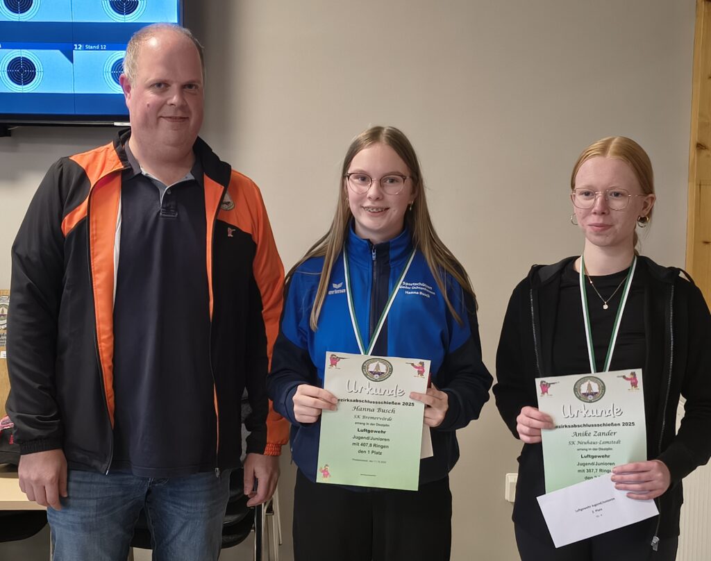 Luftgewehr-Schülerklasse 1. SK Bremervörde (383,6 Ringe), 2. SK Neuhaus-Lamstedt (369,1), 3. SK Zeven (331,5). 1. Laura Marie Buck (BRV/196,5), 2. Nele Zander (N-L/194,8), 3. Mio Dallmann (ZEV/189,9). Jugend/Junioren. 1. SK BRV (793,6), 2. SK N-L (765,4), 3. SK ZEV (737,7). 1. Hanna Busch (BRV/407,8), 2. Annike Zander (N-L/387,7), 3. Stella Wülbern (BRV/385,8).