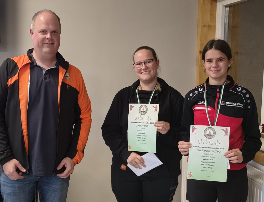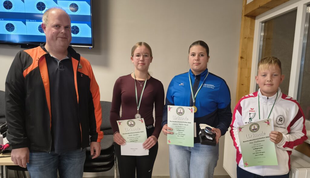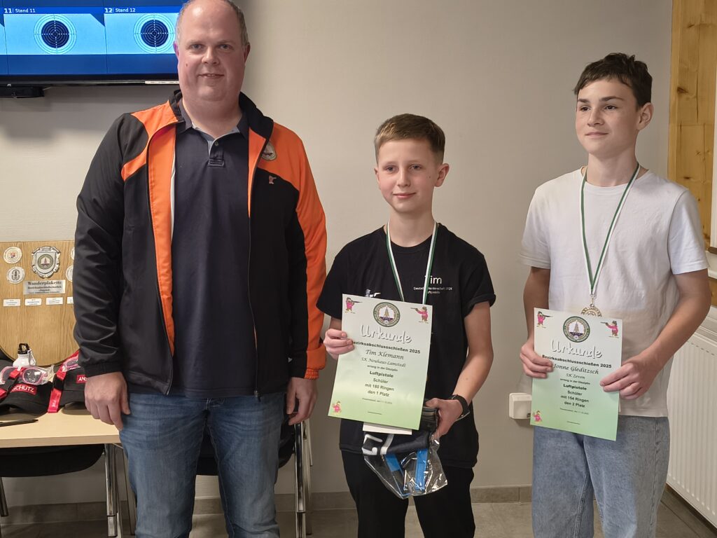Luftpistole-Schülerklasse. 1. SK ZEV (278), 2. SK N-L (180). 1. Tim Klemann (N-L/180), 2. Jonne Gleditzsch (ZEV/154), 3. Leon Venske (ZEV/124). Jugend/Junioren. 1. SK ZEV (646), 2. SK N-L (253). 1. Finja Brandt (ZEV/336), 2. Katharina Steffens (ZEV/310), 3. Cilina Schwiemann (N-L/253).