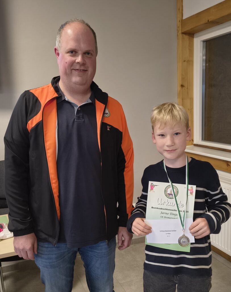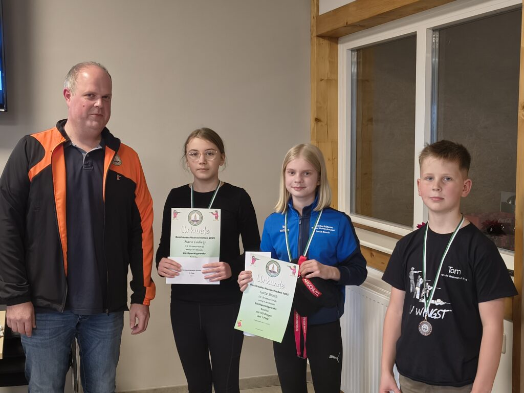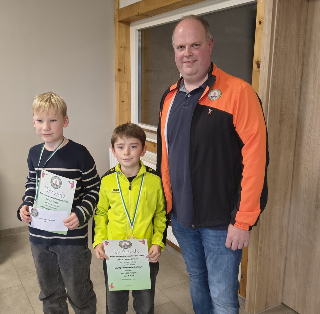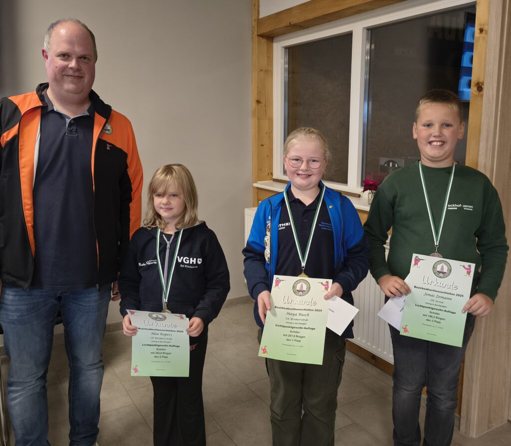 Lichtpunktpistole-Schülerklasse. 1. SK BRV (186). 1. Louisa Klintworth (BRV/95), 2. Jarno Tönjes (BRV/91). Lichtpunktgewehr-Auflage –Schülerklasse1. SK BRV (409,0), 2. SK ZEV (393,5), 3. SK N-L (159,3). 1. Maya Busch (BRV/207,0), 2. Alea Ropers (BRV/202,0), 3. Jonas Zemann (ZEV/198,2).