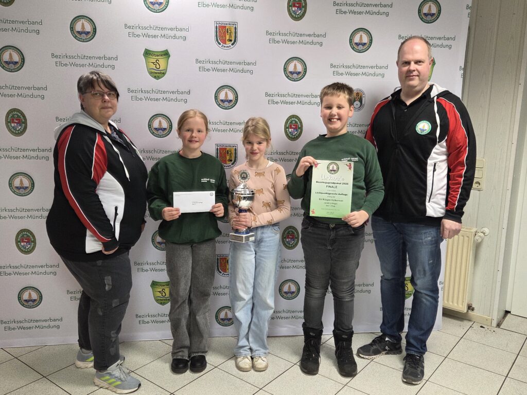 Die Nachwuchsschützen des Bezirksschützenverbandes Elbe-Weser-Mündung traten in Nieder Ochtenhausen an und kämpften um die Jugendpokale. Auf dem Programm standen die Disziplinen Lichtpunktgewehr-Freihand und Auflage, Luftgewehr und Luftpistole. Besonders hervorzuheben sind die 395 Ringe, die Hanna Busch mit dem Luftgewehr erzielte.
