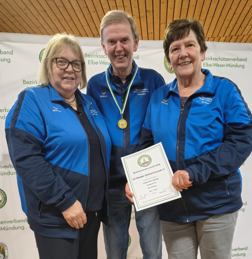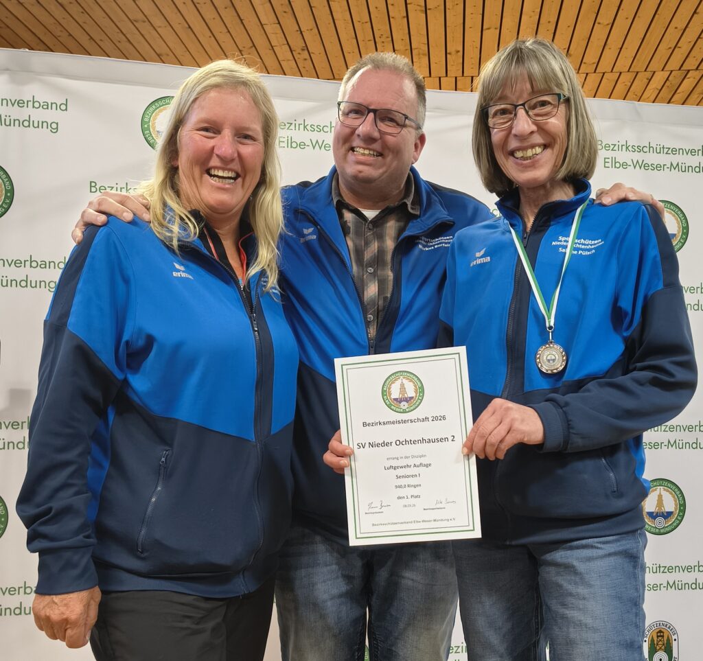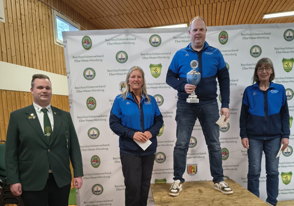 Der Schießstand in Nieder Ochtenhausen war Schauplatz der Bezirksmeisterschaften mit den Luftdruckwaffen. Drei Disziplinen endeten traditionell mit einem Finalschießen im Ko-Modus. Äußerst spannend verlief die Entscheidung im Luftgewehr-Auflage-Wettbewerb. Um die Medaillen kämpfte schließlich das Trio des Gastgebers mit Lars Busch, Annelie Matthias und Sabine Pülsch. In der vorletzten Runde musste Sabine Pülsch die Segel streichen und landete schließlich mit 207,6 Ringen auf dem dritten Platz. Lars Busch und Annelie Matthias lieferten sich ein Kopf-an-Kopf-Rennen. Beim abschließenden Gleichstand von 252,9 Ringen traten bei zum Stechschuss. Die ausgezeichneten 10,2 Ringe von Annelie Matthias reichten nicht, denn ihr Kontrahent legt 10,5 Ringe vor. Den Siegerpokal überreichten der stellvertretende Bezirkspräsident Sascha Denz und Bezirkssportleiterin Ute Siems.